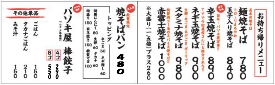 お気付きの方も多いと思いますが "バソキ屋" は下から(反対から)読めば "ヤキソバ" です。