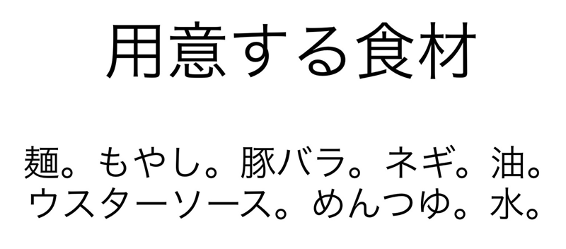 麺3食入・もやし2袋・ネギ1束・豚バラ肉150g・サラダ油(ごま油でも可)・ウスターソース・めんつゆ・水